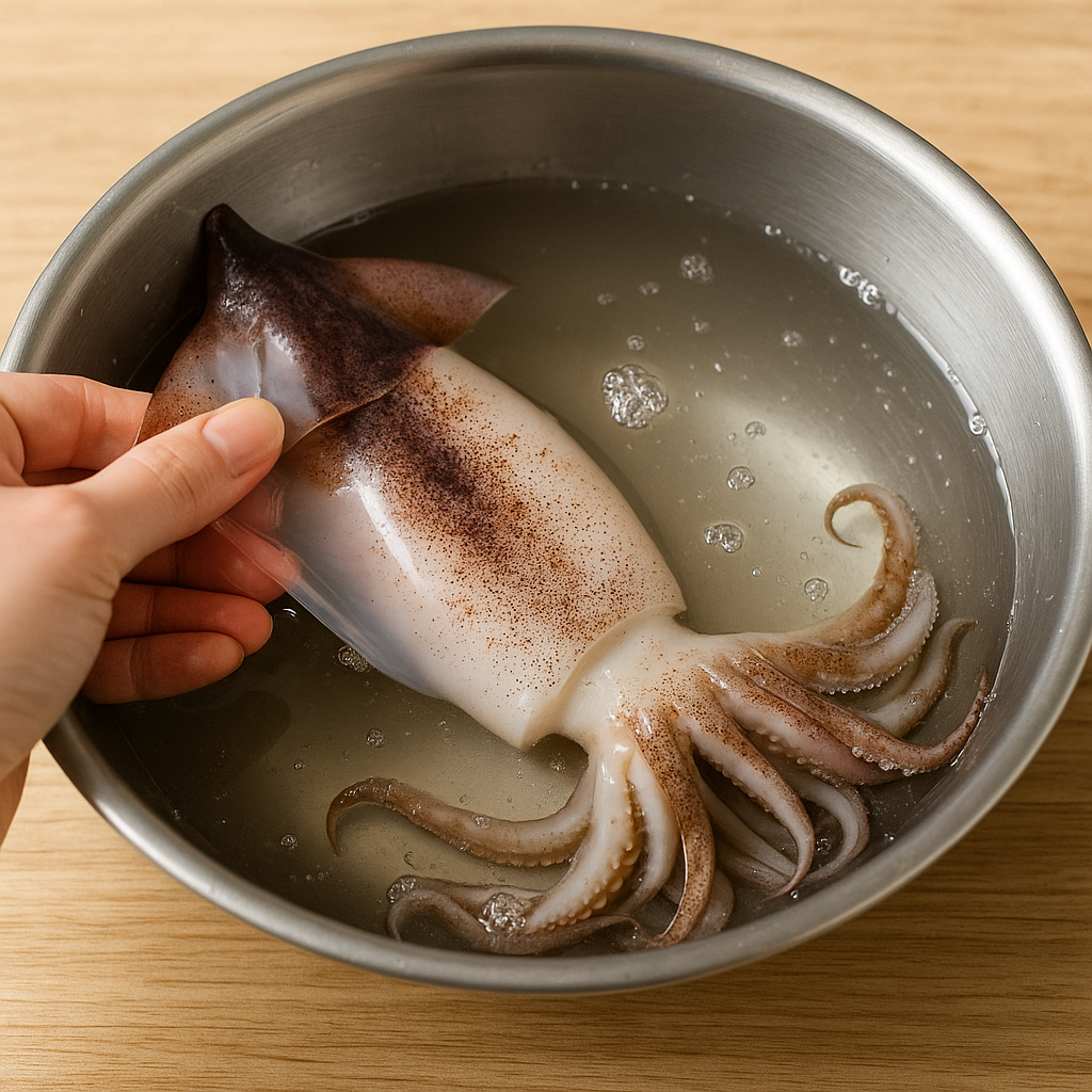 오징어는 껍질을 벗기지 않아도 되지만, 보기 좋게 벗겨주는 것도 좋아요.