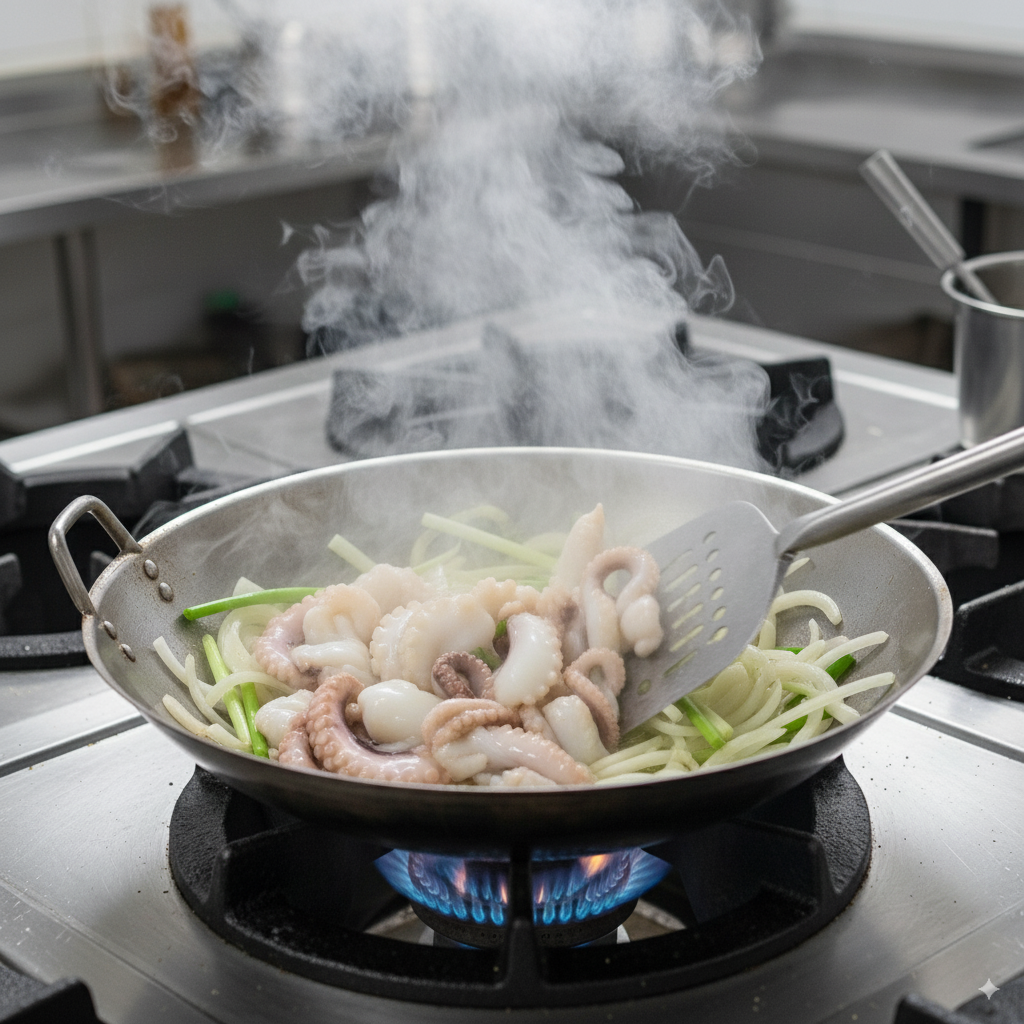 낙지를 넣고 강불에서 빠르게 볶아주세요. 2~3분 정도만 익히는 게 포인트예요. - 양념장 넣기